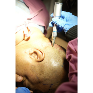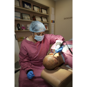 Technician performs SMP to give the appearance of fuller hair in a clinical setting.