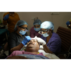 Medical team conducts a precise facial cosmetic procedure, focusing on patient care and treatment accuracy.