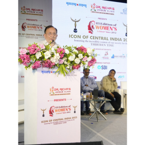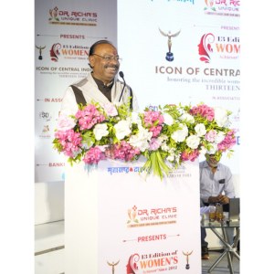 MLA Krishna Khopde delivers a keynote speech at Dr. Richa’s Unique Clinic’s Icon of Central India 2025.